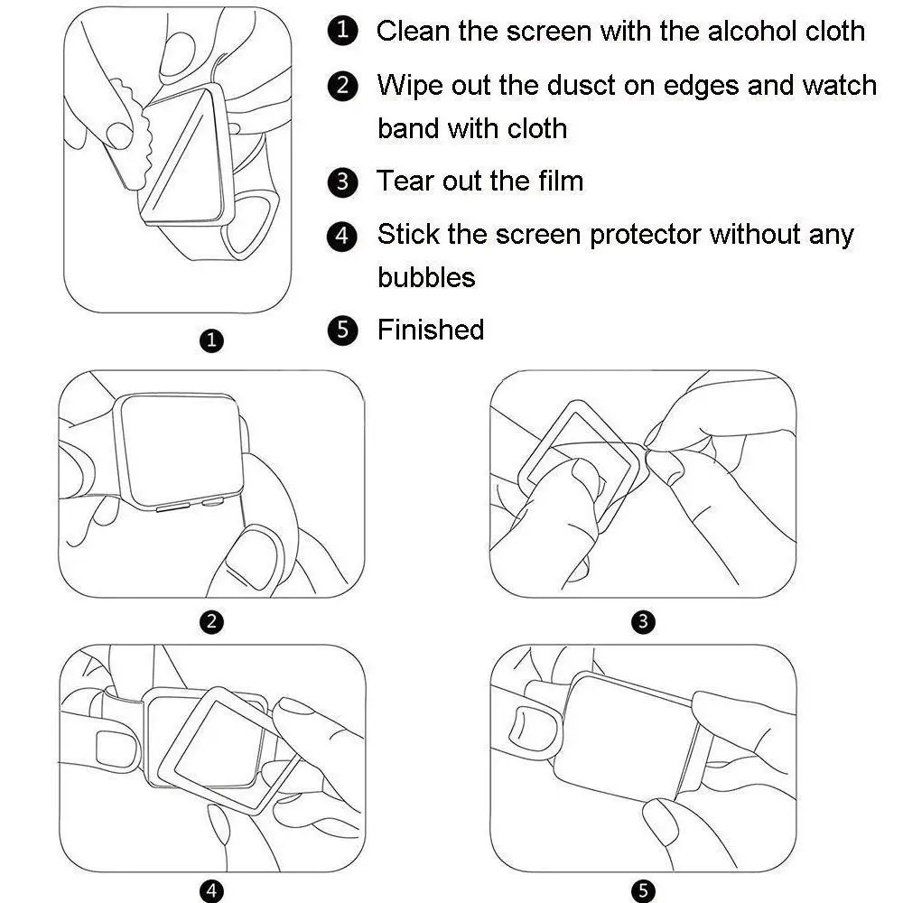 1. Clean and dry your watch screen with the included wet cloth and dry cloth. 2. Remove the dusts on the screen with the dust removal stickers. 3. Carefully peel off the backing of the screen protector. 4. Align and apply the screen protector to the apple watch screen. 5. Tightly press the edges of the film to avoid edge lifting.