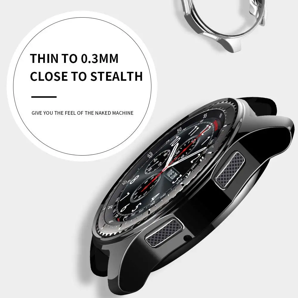 New plating TPU Protective Cases For Samsung Galaxy Watch 42mm/ 46mm Gear S3 General purpose protection Cover 22mm 20mm frame Effective Protection: soft and slim plated tpu. this case covers all around the edges, provide effective protection for Samsung Galaxy Watch 42mm/ 46mm Gear S3 General purpose from scratching, dropping, bumpbing and so on. Special design: this case just covers the edges around, not with the screen protector: Wearing the full screen protector at gym or sports activities will cause moisture under the screen protector, but this case could avoid that happened and suited for all situations. Advantage: high quality plated case for Samsung Smartwatch, makes your watch looks more high-end and durable, 6 colors to choose. Very easy to put on and take off.1* Samsung Galaxy watch case, (Only simple packaging, TPU is a rubber material, deformation does not affect the use, please understand, no watch)