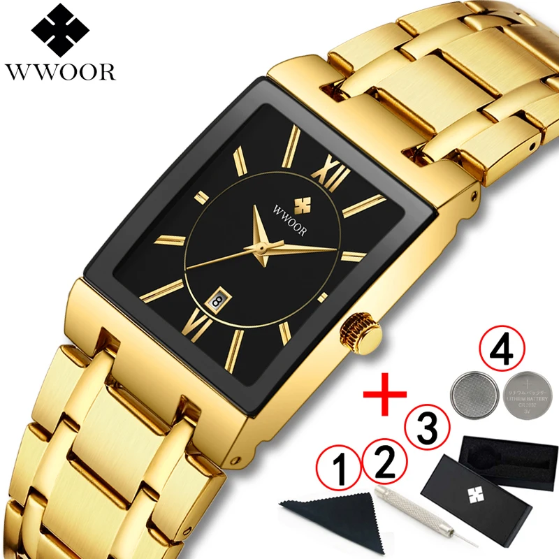 Men Watches Top Brand Luxury WWOOR Gold Black Square Quartz watch men 2021 Waterproof Golden Male Wristwatch Men watches 2021